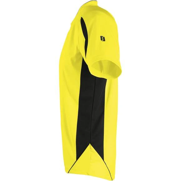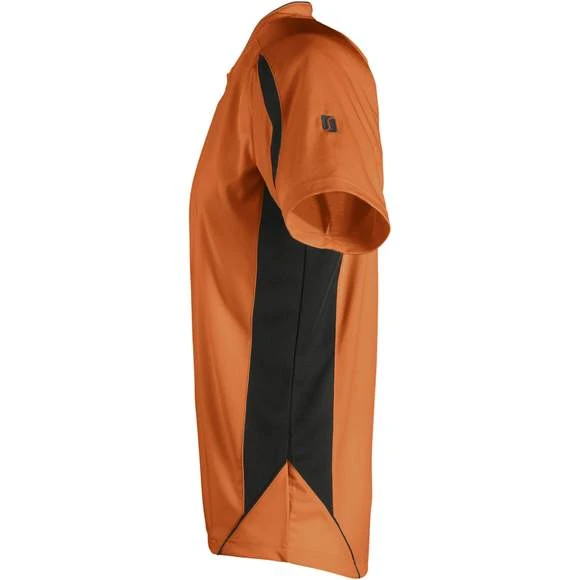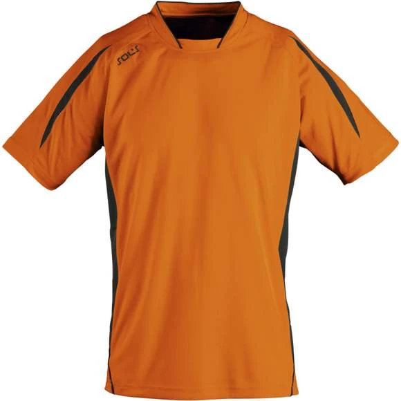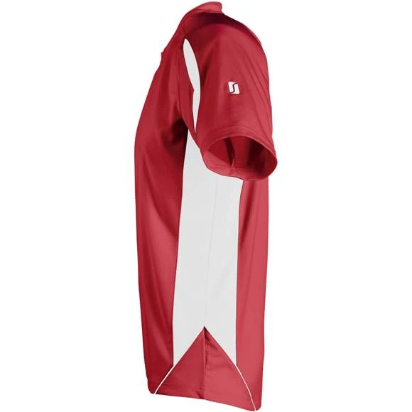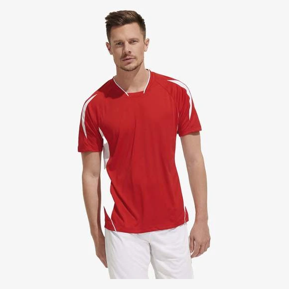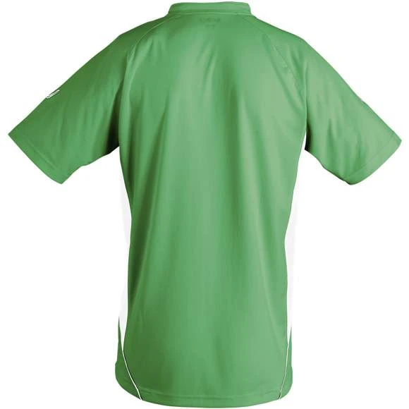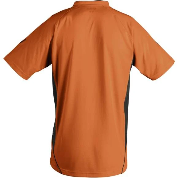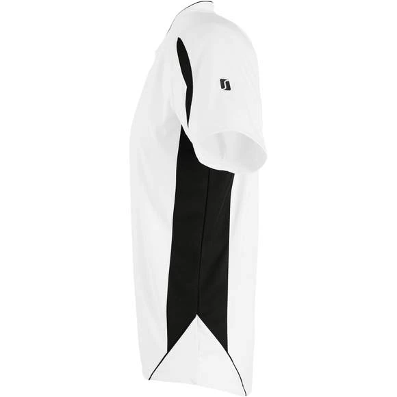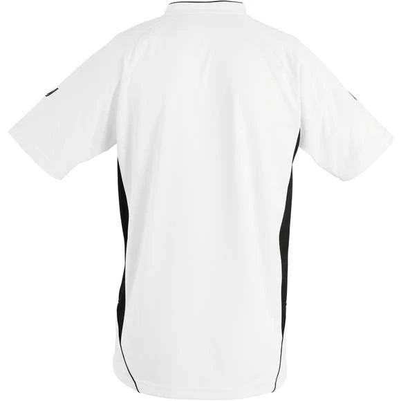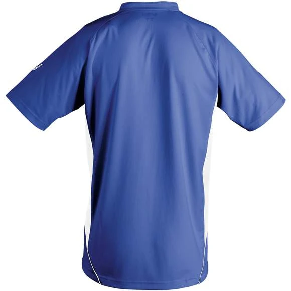 Maillot travaillé adulte manches courtes. Col fantaisie fermé avec liseré contrasté. Manches raglan. Empiècements en mesh sur les côtés et respirants sur les manches, garantissant une régulation de la transpiration. Pan arrière arrondi et légèrement rallongé. Finitions renforcées. Logo brodé contrasté. 100% polyester interlock. Grammage : 140g/m²