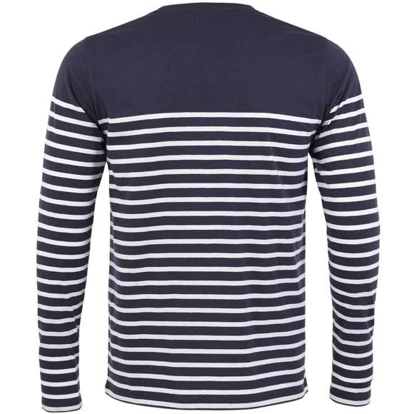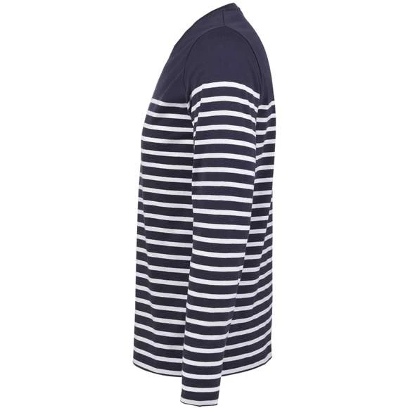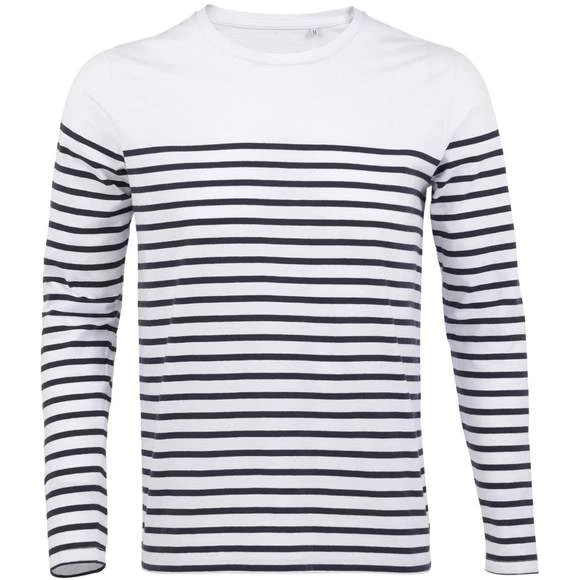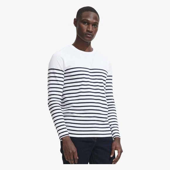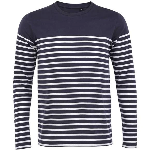 Tee-shirt homme manches longues rayĂ©, col rond, coupe droite, coupĂ© cousu, rayures placĂ©es. 100% coton peignĂ© Ringspun. Enrichi d’un traitement d’enzyme pour un touchĂ© plus doux. Grammage : 160g/m²