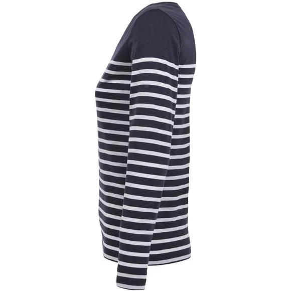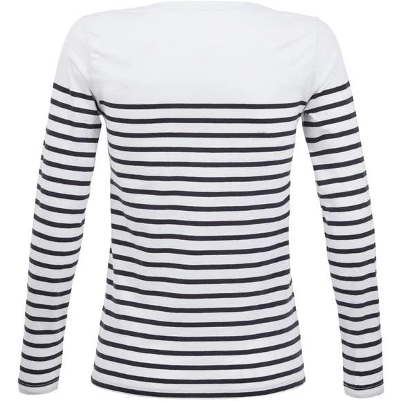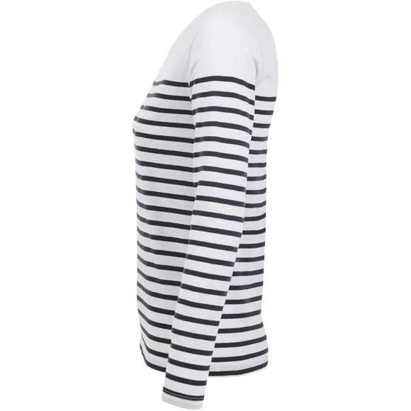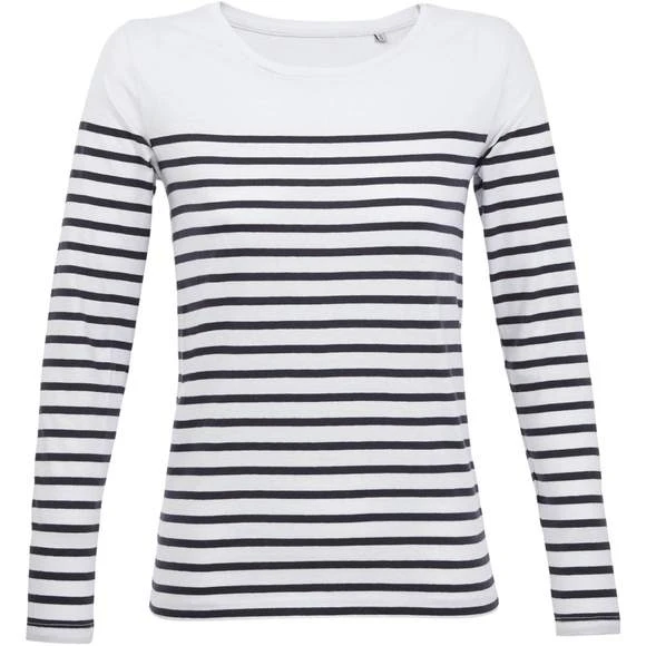 Tee-shirt femme manches longues rayĂ©, col rond, coupe droite, coupĂ© cousu, rayures placĂ©es. 100% coton peignĂ© Ringspun. Enrichi d’un traitement d’enzyme pour un touchĂ© plus doux. Grammage : 160g/m²