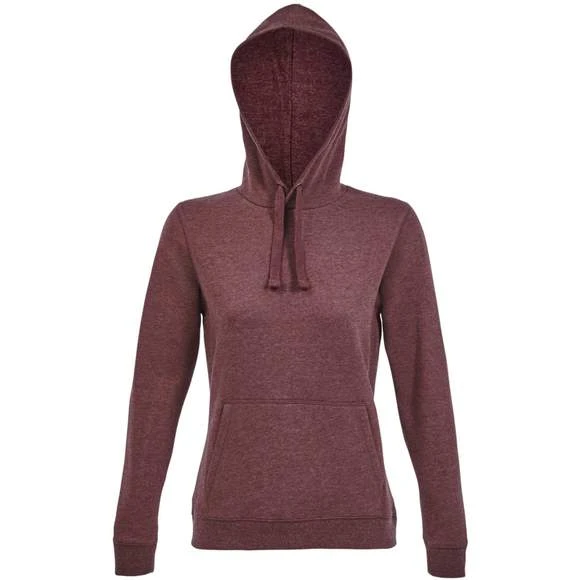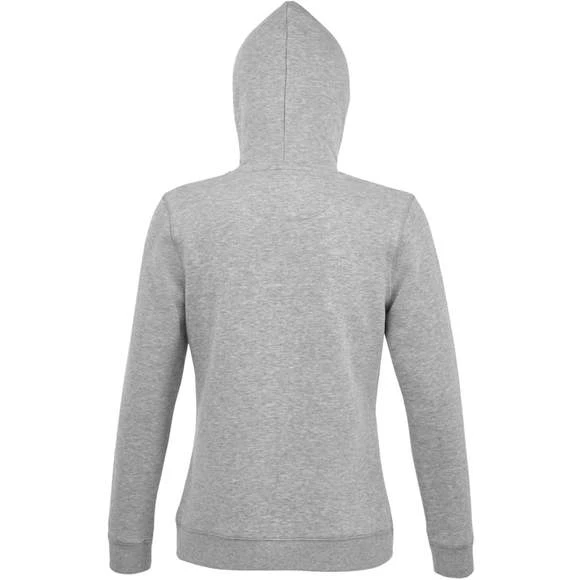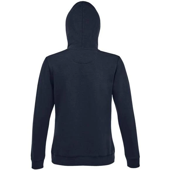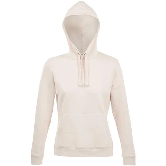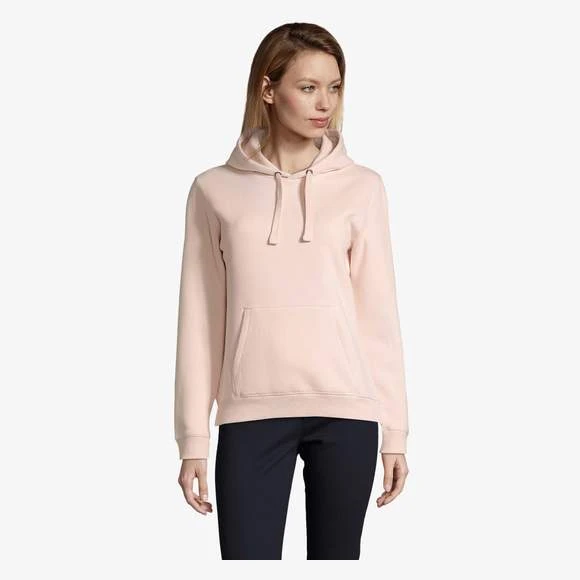 Sweat-shirt femme à capuche. Poche kangourou, coupé cousu. Capuche doublée avec cordon de serrage. Poignets et bas en bord côte 2×2. Demi-lune à l’intérieur du col, bande de propreté intérieur col. 80% coton Ringspun- 20% polyester. Intérieur gratté. Extérieur 100% coton. Grammage : 280g/m²