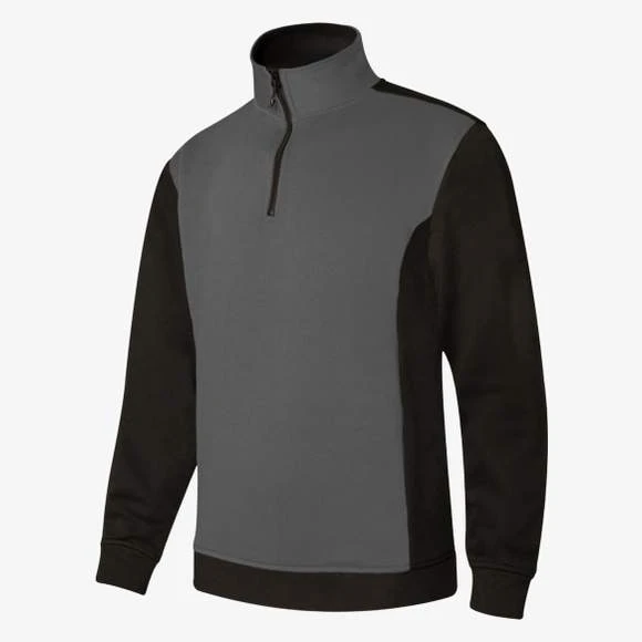 Sweat-shirt mixte. Col montant zippé. Manches, épaules, côtés, intérieur du col et bas du sweat contrastés. Poignets et taille en bords côte. Traité anti-peluche. 65% polyester/35% coton