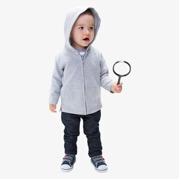 Sweat pour bébé. Zip avant , poche kangourou , faux cordons de serrage. Etiquette amovible. 80% coton 20% polyester. Grammage : 250g/m²