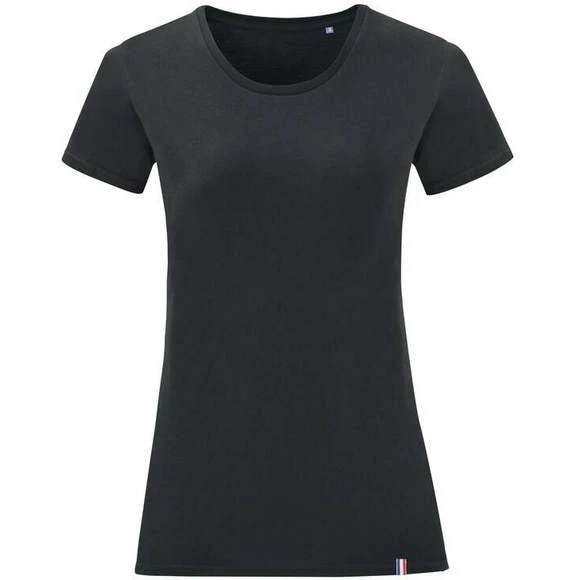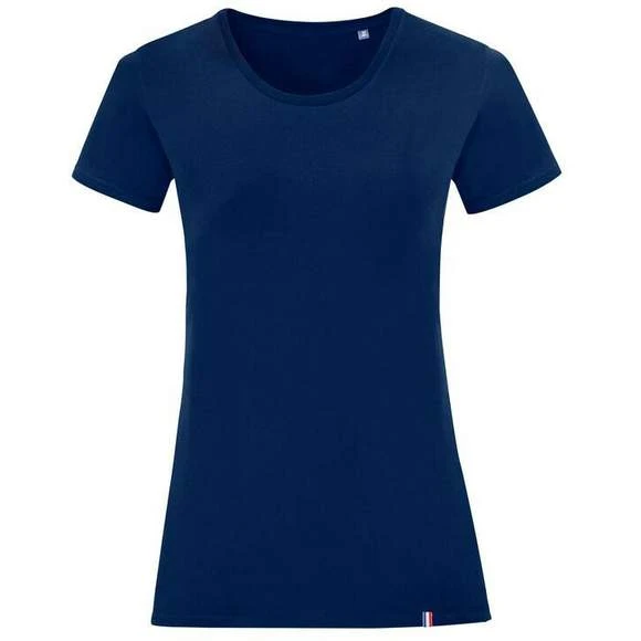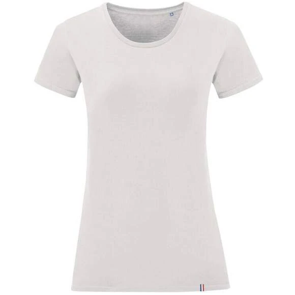 Tee-shirt bio, origine France pour femme. Coupe cintrée. Col rond. Pas d’étiquette de marque, seulement une puce de taille au col. Composition cousue dans la couture intérieure latérale gauche. Coton peigné de belle qualité. Bande de propreté au col. Double surpiqure bas et manches. Drapeau tricolore sur la manche. Origine France garantie. Composition : 100% coton peigné jersey organique. Grammage : 190g/m²