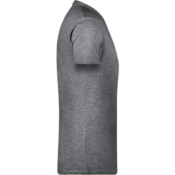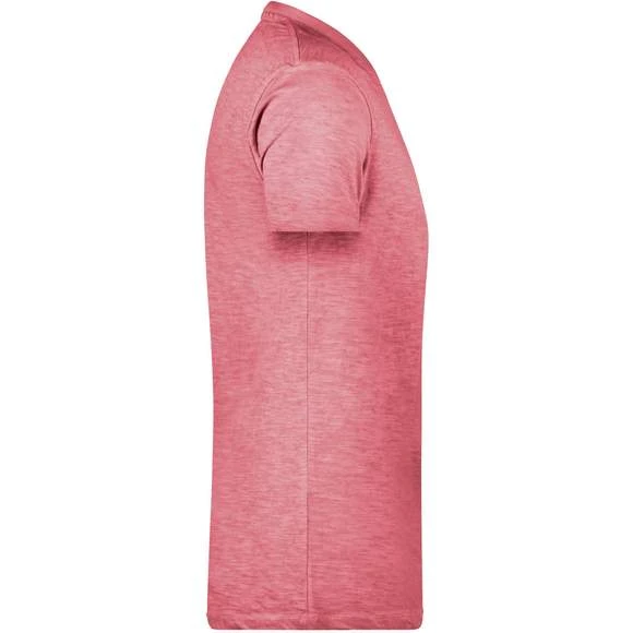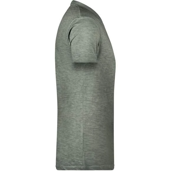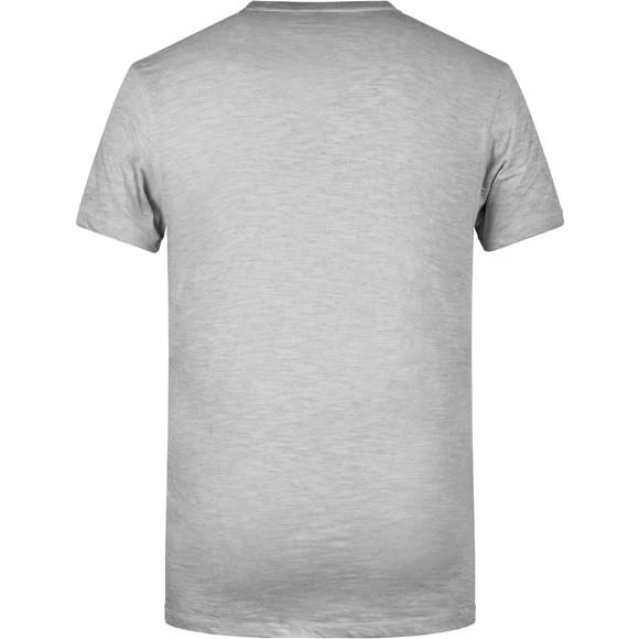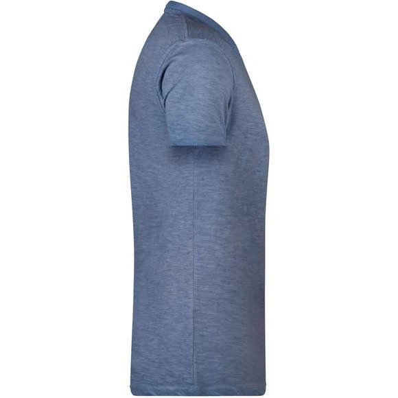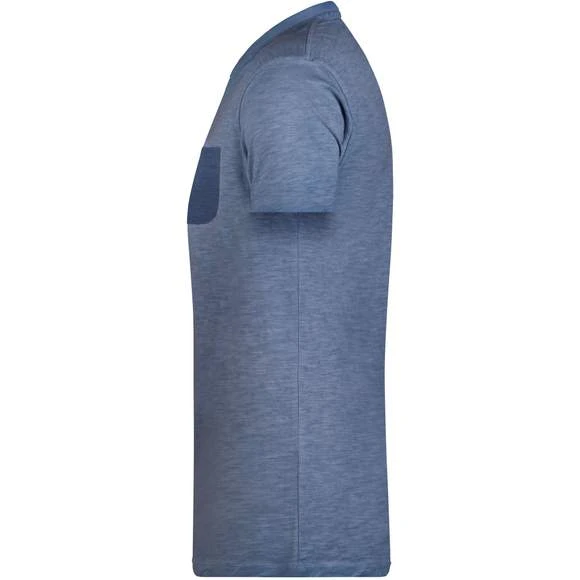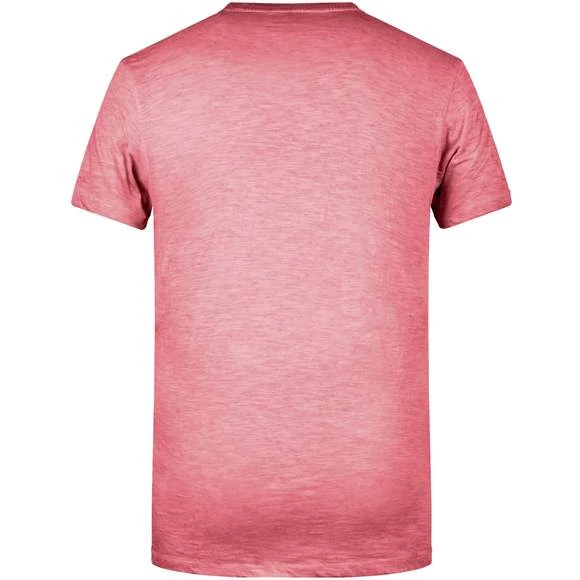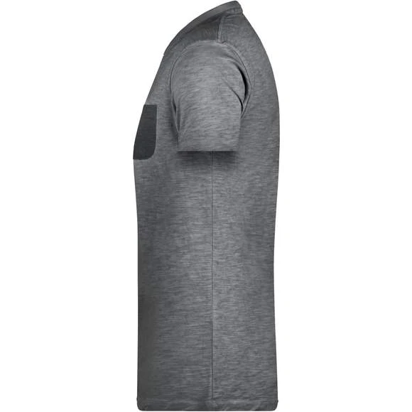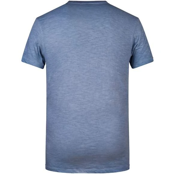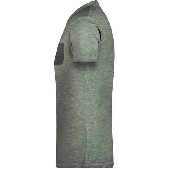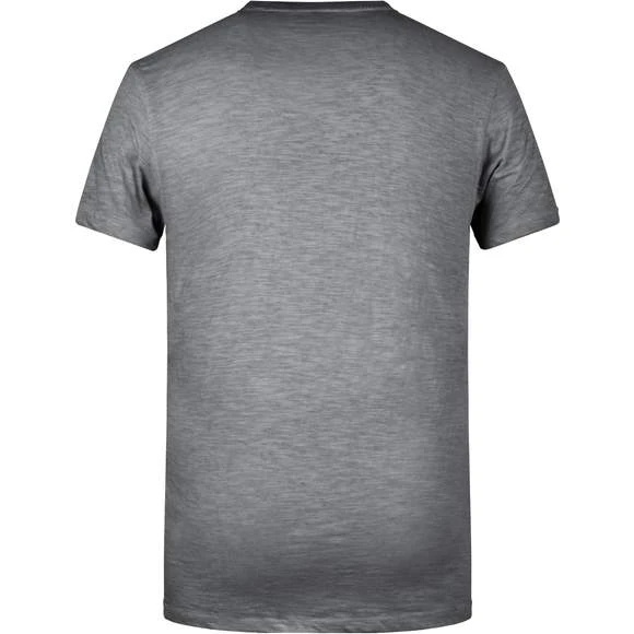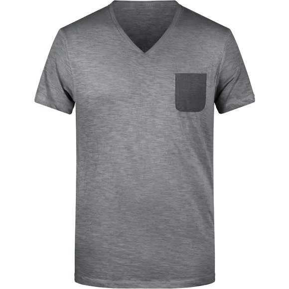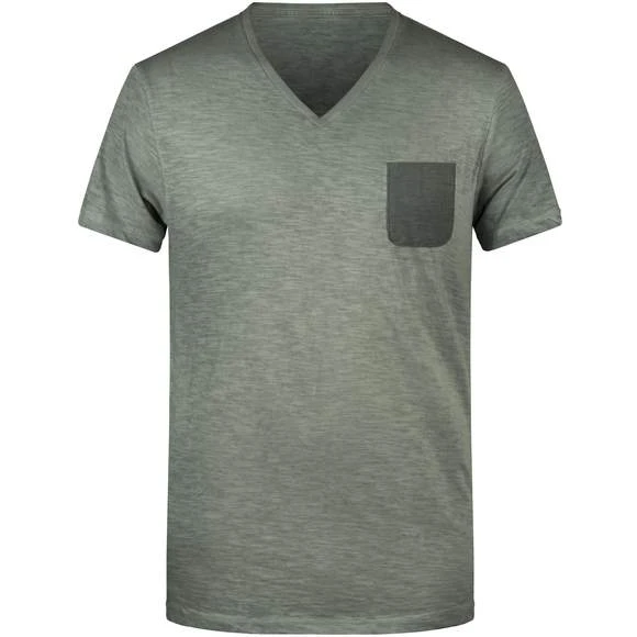 T-shirt pour homme au look vintage. Jersey simple en fil flammé et coton biologique peigné et filé à l’anneau. Technique élaborée d’impression par pulvérisation. Possède un col en V, des poignets en élasthanne, une poche poitrine de couleur contrastée 9 x 10,5 cm. Composition : 100% coton. Grammage : 150g/m²