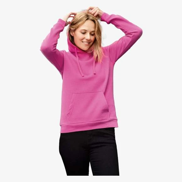 Sweat pour femme, légèrement cintré, en tissu anti-transpirant avec doublure brossée, à capuche à double couche avec cordon de serrage. Possède une poche kangourou devant, une bande de propreté, des poignets avec de l’élasthanne. Étiquette détachable. Composition : 80% coton, 20% polyester. Grammage : 280g/m²
