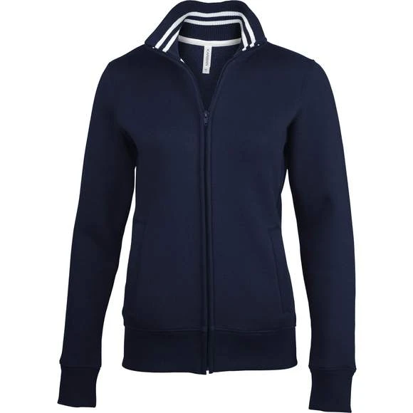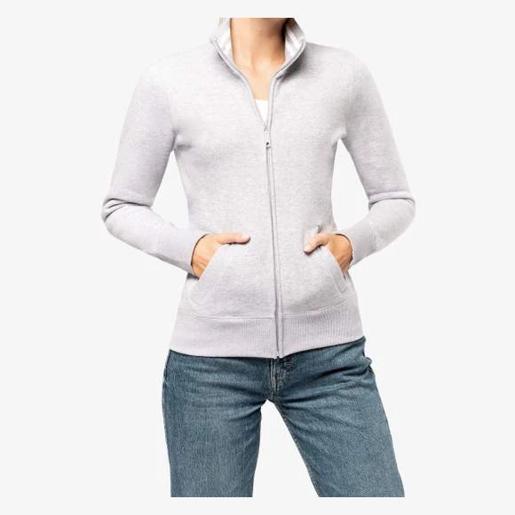 80% coton / 20% polyester « LSF ». Molleton gratté et pré-rétréci. Lavage siliconé. Coupe cintrée par une découpe latérale en bord-côte. Bande de propreté ton sur ton à l’encolure. Intérieur col bord-côte avec rayures contrastées. 2 poches devant. Finition bord-côte bas de manches et bas de vêtement. Fermeture zippée YKK. Grammage : 360g/m²