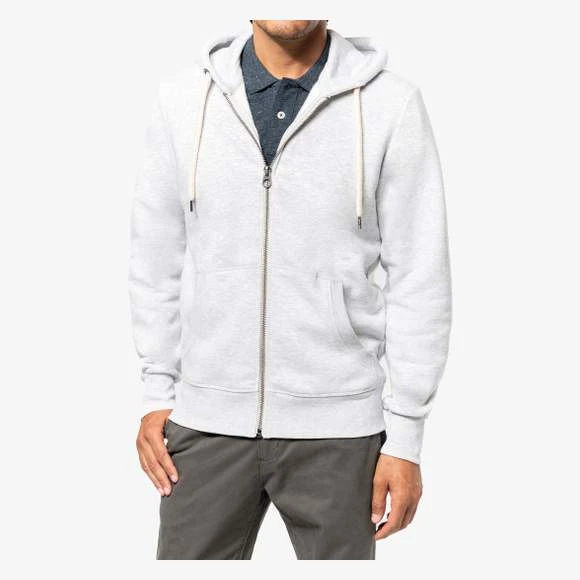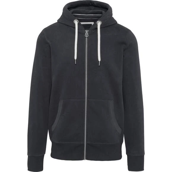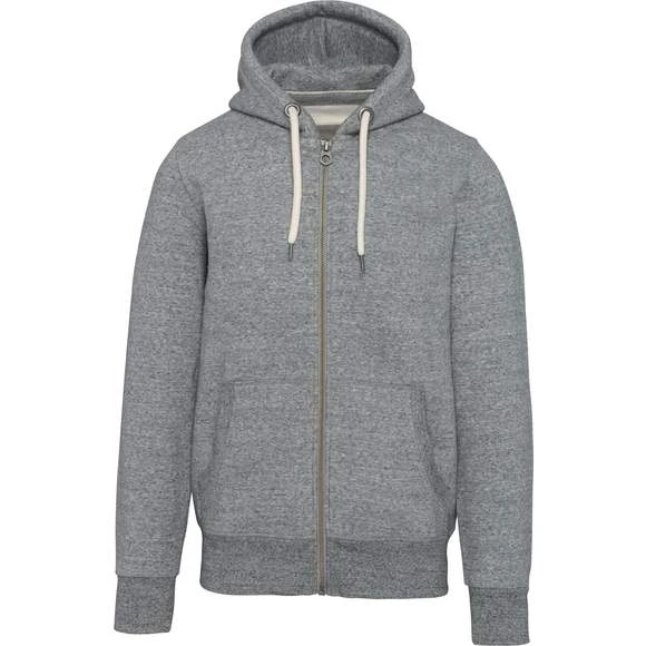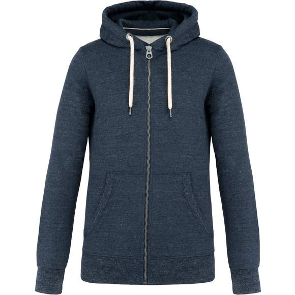 80% coton / 20% polyester (Ash Heather : 79% coton / 20% polyester / 1% viscose). Molleton gratté. Toucher peau de pêche et aspect « Vintage ». Fermeture zippée métal. Capuche doublée. Cordon capuche rond et contrasté. Double bande de propreté en chevron à l’encolure. Poches kangourou. Finition bord-côte bas de manche et bas de vêtement. Ce produit a subi un traitement spécial et présente un aspect volontairement vieilli. Ce procédé de fabrication implique des variations de couleurs d’un produit à l’autre et rend chaque pièce unique. Pas d’étiquette de marque, uniquement une indication de taille pour faciliter la personnalisation. Grammage : 350g/m²