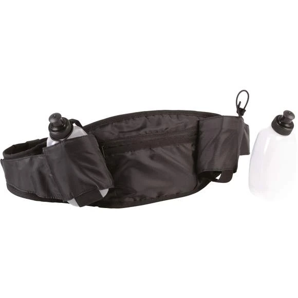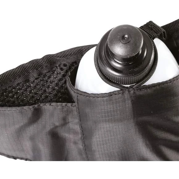 Ceinture porte bidon pour course à pied en polyester. Dos matelassé en filet respirant, poche principale zippée, 2 poches latérales porte bidon, support élastiqué porte veste de running / barre energétique. Livrée avec deux bidons de 300 ml, fermeture réglable par bande auto-agrippante. Dimensions : 30×15 cm.