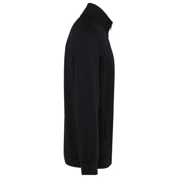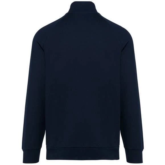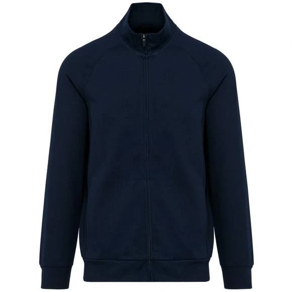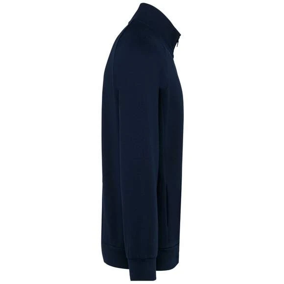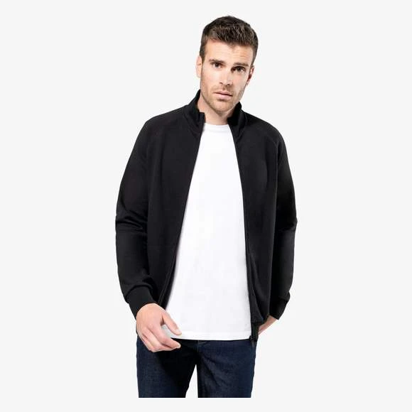 Veste zippée pour homme. Coton peigné. Tissu interlock. Traitement LSI (Low Shrinkage Interlock). Surpiqûres au col. Bande de propreté sur l’encolure intérieure. Zip nylon ton sur ton avec zipper métal et finition bande de propreté à l’intérieur. Manches raglan. Rib 1×1. 2 poches prisent dans la couture de l’empiècement. Pas d’étiquette de marque, uniquement une puce de taille. Composition : 70% coton, 4% élasthanne, 26% polyester. Grammage : 320g/m²