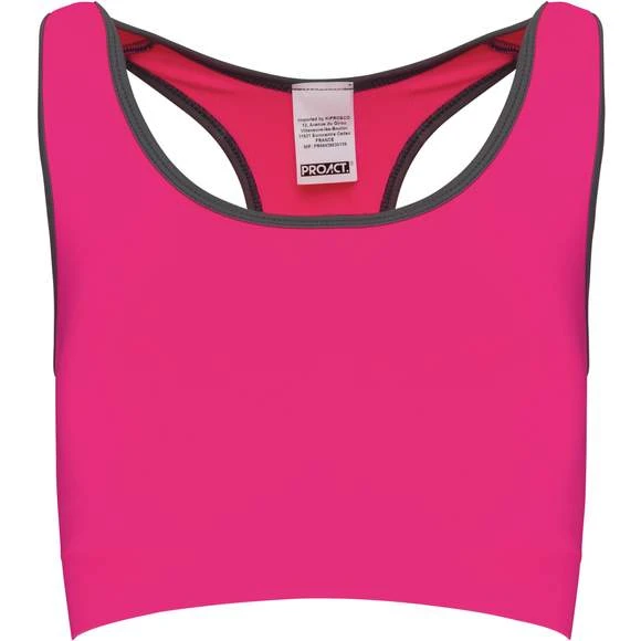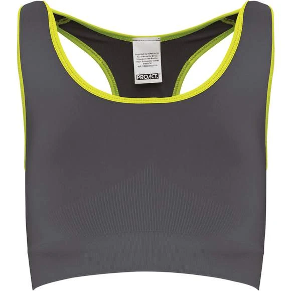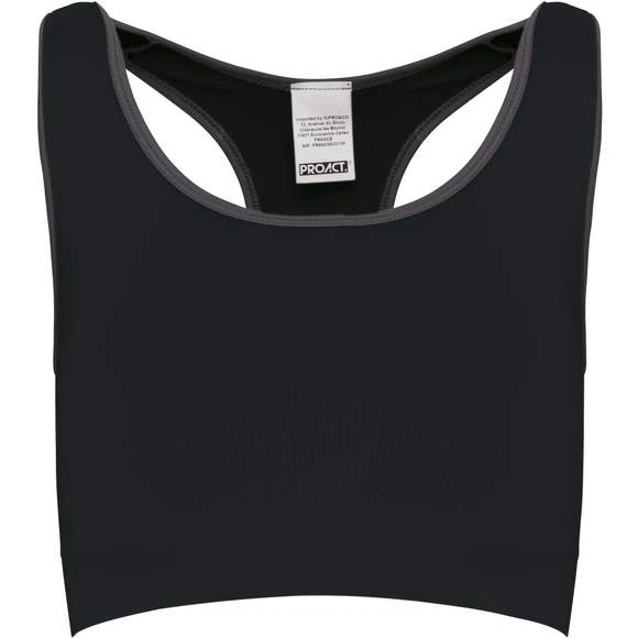 94% polyamide / 6% élasthanne. Dos nageur. Tissu doublé et tricotage ergonomique pour un excellent maintien et confort grâce à sa conception sans couture. Biais contrasté à l’encolure et aux emmanchures. Coupe étudiée pour une pratique multisports. Grammage : 180g/m²
