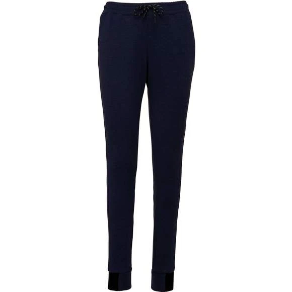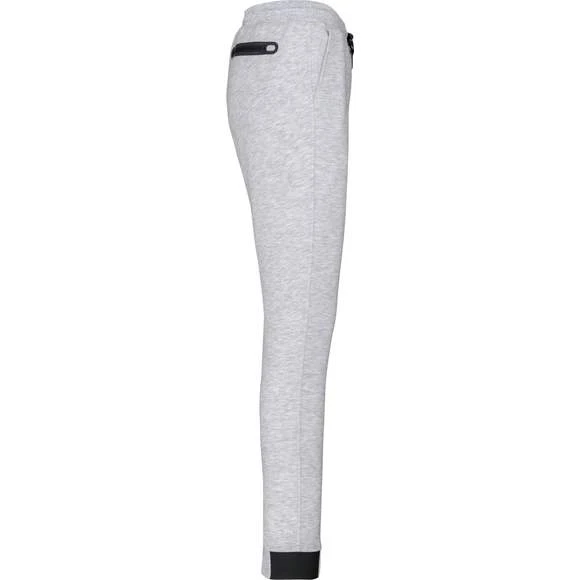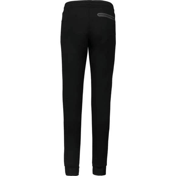 94% polyester / 6% élasthanne (79% polyester / 15% viscose / 6% élasthanne pour coloris chiné). Matière ultra confortable. Ceinture élastiquée avec cordon de serrage bicolore finition embout plastique. 2 poches devant doublure jersey 65% polyester / 35% coton et 1 poche arrière zippée finition thermosoudée. Coupe moderne et ajustée. Bas de jambes resserré avec une partie élastiquée contrastée. Grammage : 310g/m²