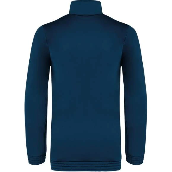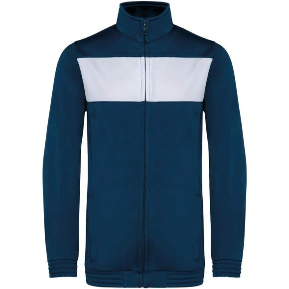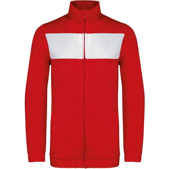 100% polyester tricot. Fermeture zippée. Empiècement poitrine contrasté. 2 poches latérales zippées. Bas de manches et de vêtement élastiqués. Coupe ajustée moderne. Grammage : 210g/m²