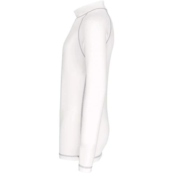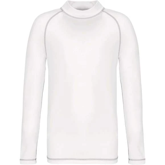 Tee-shirt technique à manches longues. Modèle pour enfant spécialement conçu pour le sport. Maille extensible. Coupe skinny. Protection UV50+ correspondant à la norme EN13758-1&2. Manches longues raglan avec surpiqûres contrastées. Col montant. Boucle élastique insérée dans l’ourlet devant permettant de passer le cordon du short afin de stabiliser le t-shirt. Finition double aiguilles aux manches et bas de vêtement. Etiquette de marque déchirable pour faciliter la personnalisation. Composition : 88% polyester recyclé et 12% élasthanne. Grammage : 160g/m²