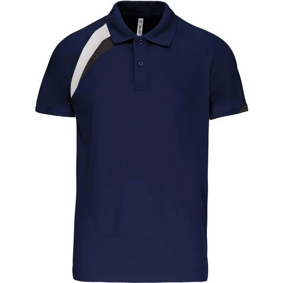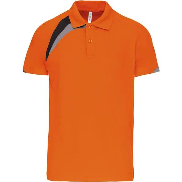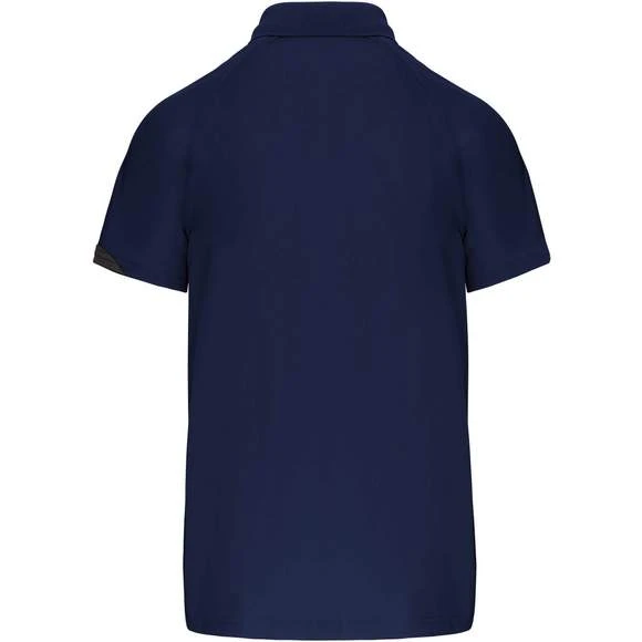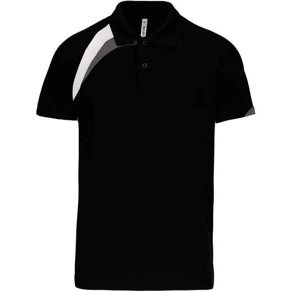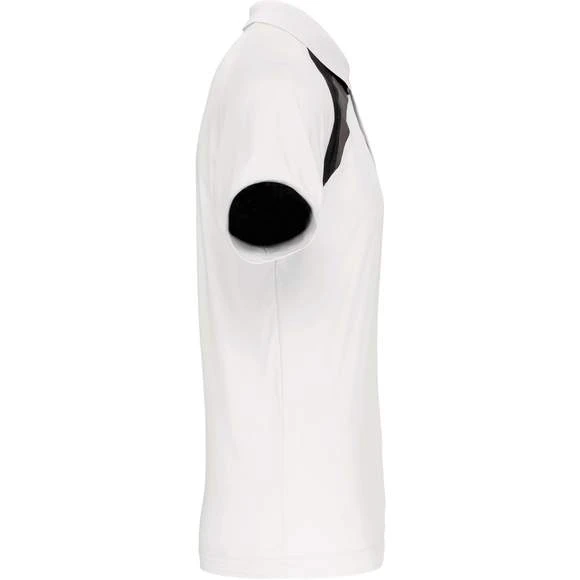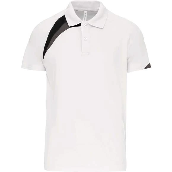 100% polyester. Tissu à séchage rapide. Empiècements contrastés. Col bord-côte 1×1 et 2 boutons ton sur ton. Finition points de recouvrement ton sur ton. Finition double aiguille au bas de vêtement et manches. Grammage : 140g/m²