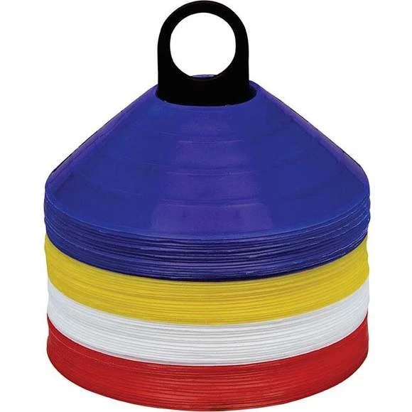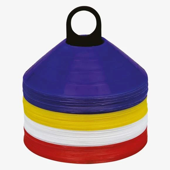 100% polyéthylène basse densité. Kit de délimitation conique avec support de transport. Jeu de 60 coupelles (15 pièces x 4 coloris différents) de 5 cm de hauteur. Bonne visibilité pour les entrainements en intérieur ou sur gazon.