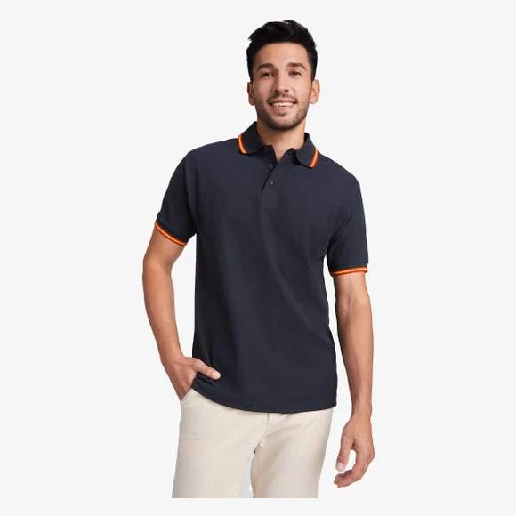 Polo manches courtes, col et bord de manches en jackard avec patte de boutonnage 3 boutons. Bande de propreté a l´encolure. Détail drapeau brodé dans le dos. Poche optionnelle. Étiquette détachable. Composition : 65% polyester / 35% coton. Couleur: 190 g/m². Grammage : 210g/m²