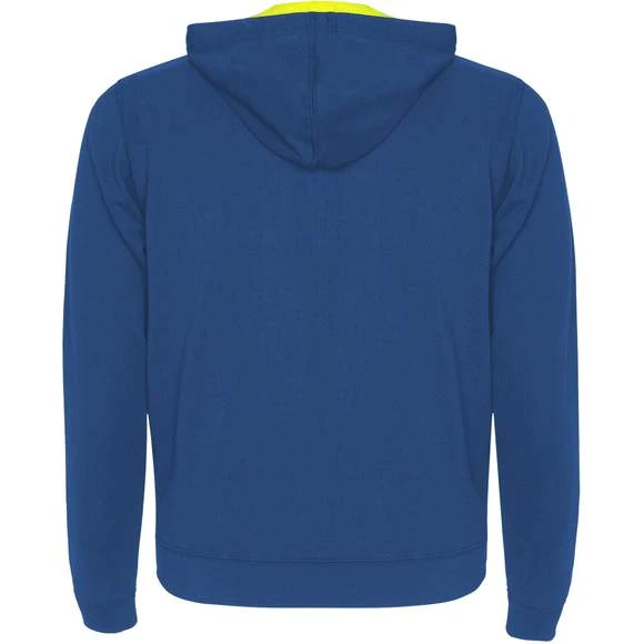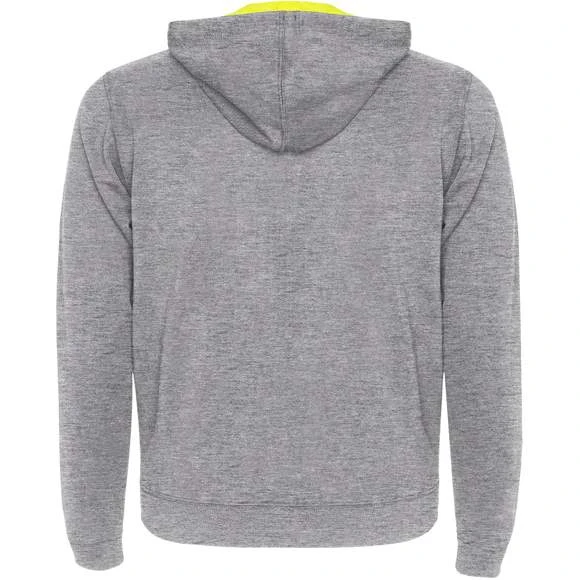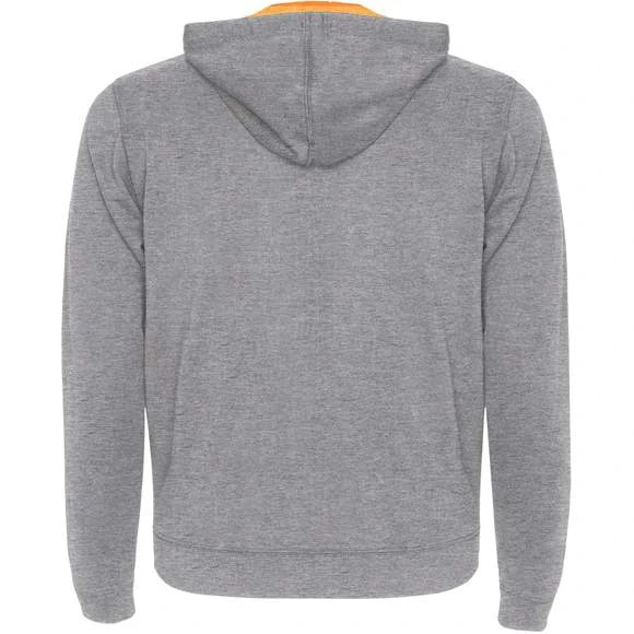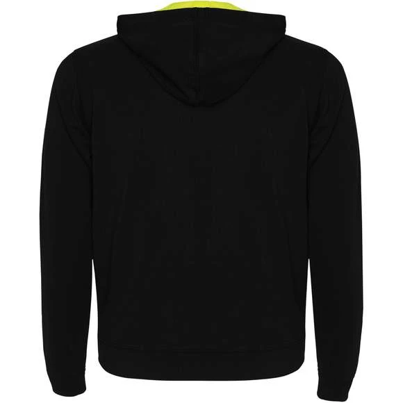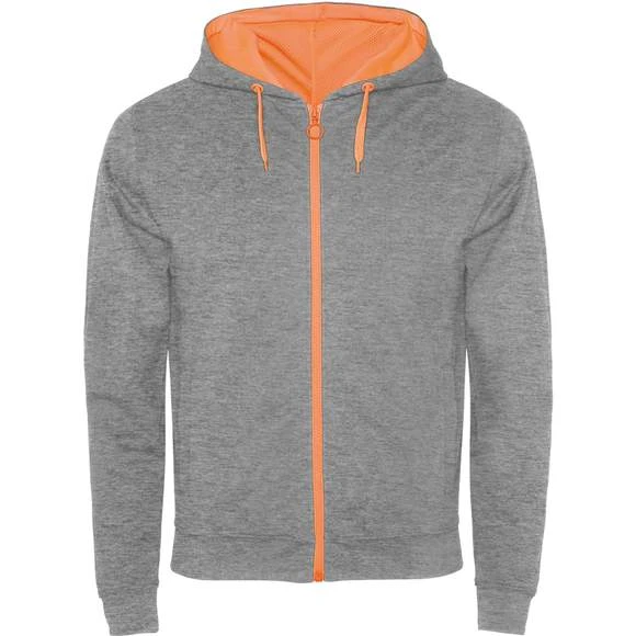Veste en maille molleton non gratté avec details fluo. Fermeture éclair centrée avec curseur arrondi en contraste fluo. Capuche avec doublure interieur en polyester micro perforé et cordon avec oeillets métalliques tous deux en contraste fluo. Manches longues avec poignets et ceinture en côte 1×1. Deux poches frontales avec liseré large. Encolure avec bande de propreté renforcée. Étiquette détachable. Traitement anti-bouloches. Composition : 60% coton / 40% polyester, Couleur gris chiné : 85% coton / 15% viscose. Grammage : 280g/m²